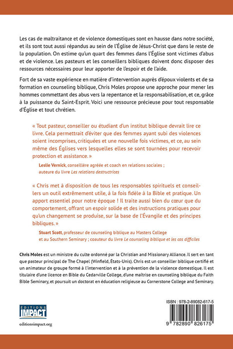 Fort de sa vaste expérience en matière d’intervention auprès d’époux violents et de sa formation en counseling biblique, Chris Moles propose une approche pour mener les hommes commettant des abus vers la repentance et la responsabilisation, et ce, grâce à la puissance du Saint-Esprit. Voici une ressource précieuse pour tout responsable d’Église et tout chrétien.