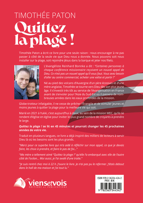 Timothée Paton a écrit ce livre pour une seule raison : nous encourager à ne pas passer à côté de la seule vie que Dieu nous a donnée. Nous pouvons soit nous installer sur la plage, soit rejoindre Jésus dans la barque et jeter nos filets.