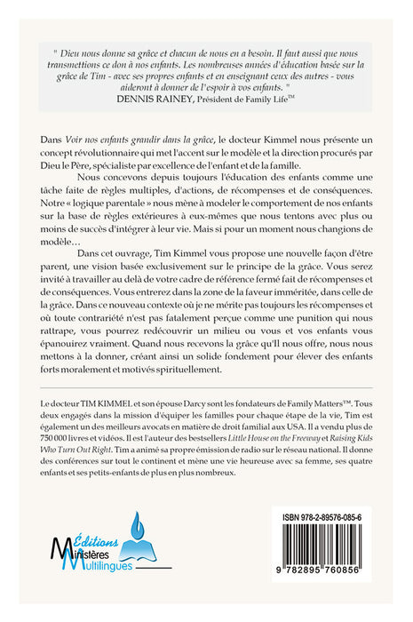 Dans ce livre Voir nos enfants grandir dans la grâce, Tim Kimmel vous propose une nouvelle façon d'être parent. Une vision basée exclusivement sur le principe de la grâce. Vous entrerez dans la zone de la faveur imméritée, dans celle de la grâce. Dans ce nouveau contexte où je ne mérite pas toujours les récompenses et où toute contrariété n'est pas fatalement perçue comme une punition venant de l'au delà, vous pourrez redécouvrir un milieu ou vous et votre enfant vous épanouirez vraiment.